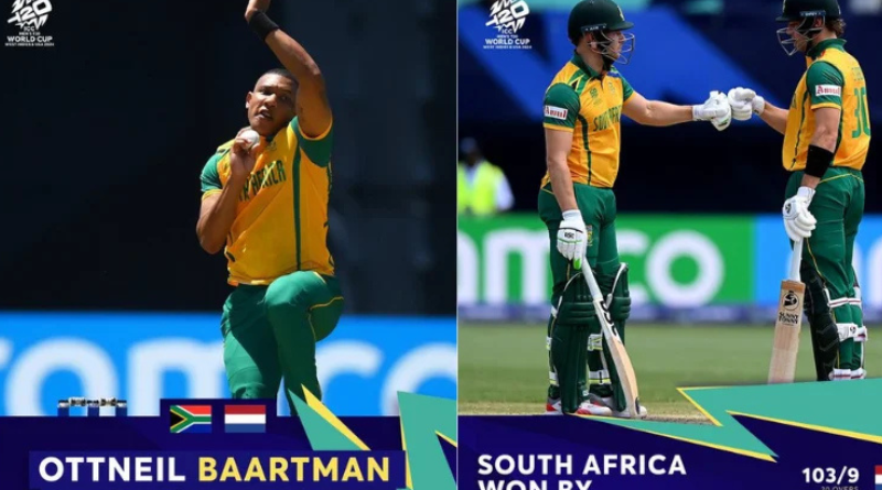 Earlier, South Africa’s disciplined bowling attack, led by Ottneil Baartman, who claimed 4 wickets, restricted the Netherlands to 103/9 in 20 overs after winning the toss and opting to bowl first.